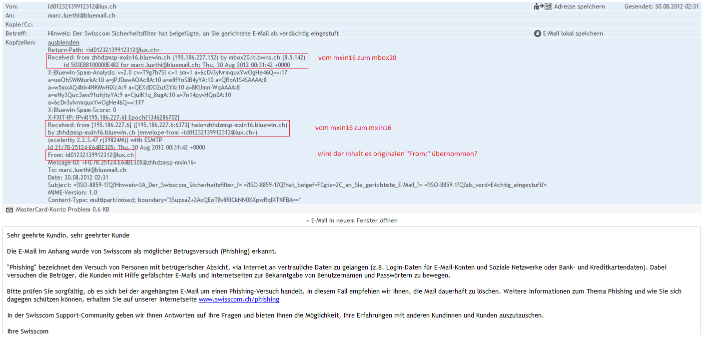 Untenstehende Mail (screenshot) stammt wohl tatsächlich vom Swisscom Sichherheitsfilter/Virenfilter.