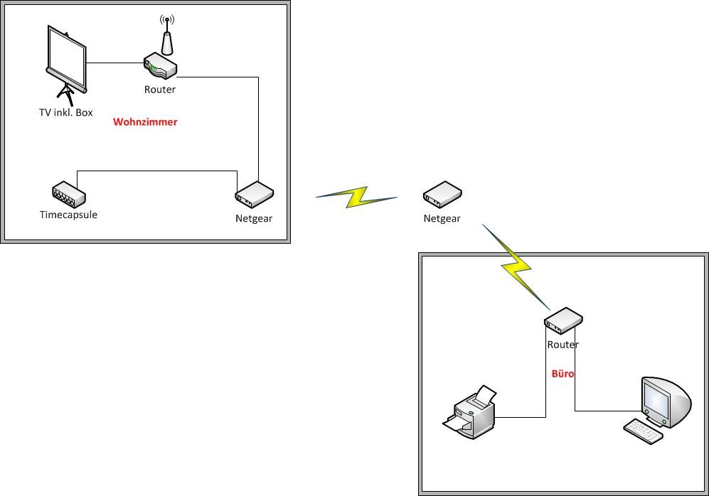 Aber wie schon erwähnt, geht die TC nicht grundsätzllich nicht! Sie ist ansprechbar. Wenn an Netgear (Netzverlängerung) angeschlossen, geht das Büro (welches auch an Netgear hängt; sh. meine Grafik). Aber Wireless Client findent dann TC nicht. Und wenn an Router (Centro) angeschlossen, kann Client via Wireless auf TC zugreifen. Büro aber nicht. Alles klar?