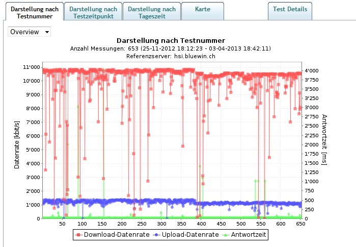 Den lustigen Performancetest speed.bluewin.ch haben wir natürlich auch gemacht, ich zeig euch mal ein Bild von meiner Speedhistory seit November...