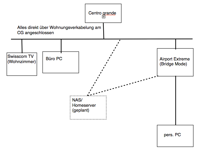 Der Centro Grande (Pirelli) verteilt das Internet im ganzen Haus, das WLAN des CG ist aus. Im Wohnzimmer steht eine SC-TV Box, die per LAN angeschlossen ist. Dann ist da der Büro-PC, auch per LAN angeschlossen (ist noch eine recht alle XP-Kiste). Dann in meinem Zimmer steht eine Airport Extreme, an welche mein iMac und XBox angeschlossen sind. Die AE übernimmt das WLAN. An ihr sind auch noch ein Drucker und eine Festplatte angeschlossen.