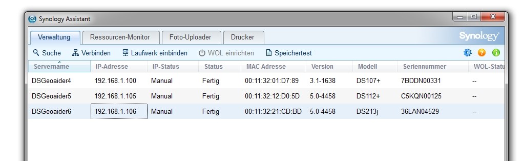 Die NAS wurden den ganzen Vormittag nicht erkannt, ohne Aenderung der Konfiguration gibt die CG nun die IP heraus und die NAS werden via Synology Assistent erkannt.