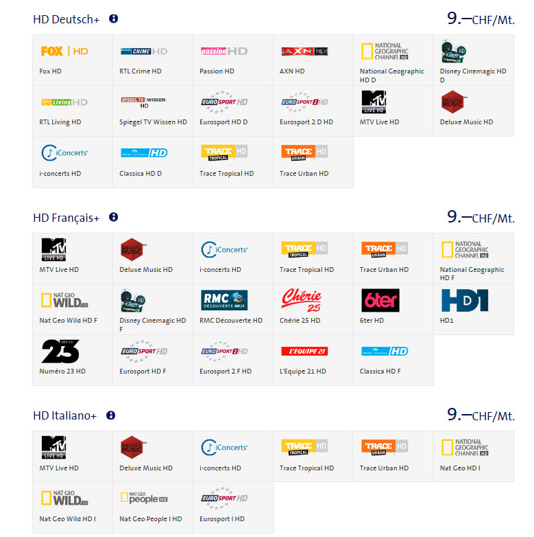 nico @Neu schrieb: Ist der Sender "Nat Geo Wild" nicht im Swisscom TV 2.0 plus nicht enthalten? Der Sender ist nur im italienischen oder franzörischen HD-Sprachpaket. Auf Deutsch nur über Teleclub. nico
