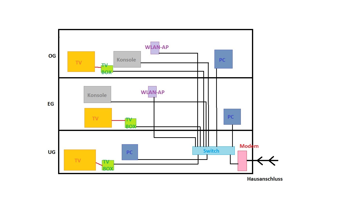 Im Keller kommt die Leitung rein, geht von dort ins Modem das im Serverschrank steht und vor dort hoch in den Switch (eventuell wir noch ein eigener Router dazwischen geschalten, falls der im Modem nix taugt bzw. die nötigen Einstellungen nicht bieten kann.). Vor dort aus dann die einzelnen TV Boxen (geplant sind aktuell 3 Fernseher) verbinden, welche über HDMI an die Fernseher dran kommen. Ebenfalls an den Switch dran kommen die WLAN-Accesspoints, Konsolen, Computer etc. für den Internetzugang. Funktioniert das im Prinzip so? Wenn ja, dann hier meine Fragen: