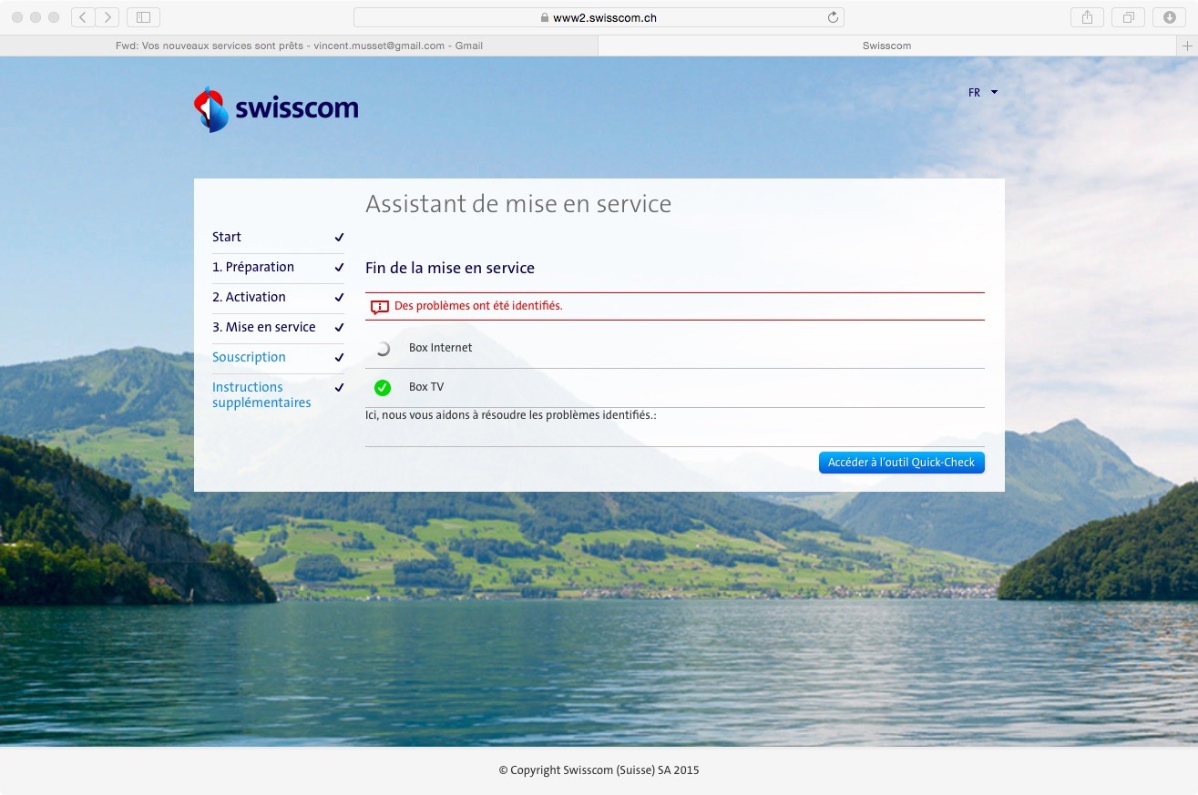 J’ai bien accès à internet et également accès à la TV sur ma Swisscom TV, cependant la dernière étape d’activation indique systématiquement que des erreurs sont détectées (voir image jointe). J’ai tenté un reset des 2 boitiers (via le petit bouton) puis refait l’activation mais j’obtiens exactement le même résultat.