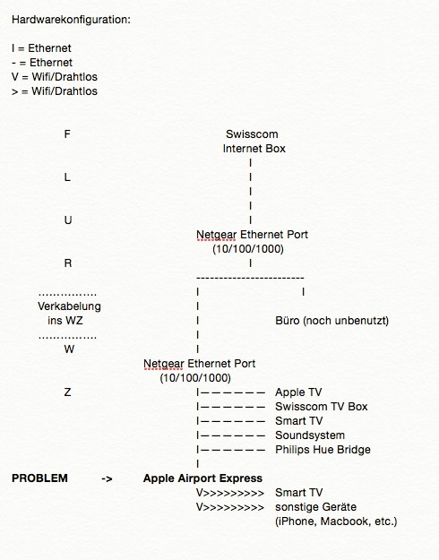 Jetzt würde ich gerne ein Airport Express als AcessPoint verwenden. Ich möchte als den Airport Express via Ethernet an meine SwisscomBox anbinden und damit DAS GLEICHE Wlan Netz erstellen, damit es quasi so aussieht, als wäre es ein grosses. Ich habe es bisher als Roaming Netzwerk versucht. Das Problem liegt aber darin, dass eines der Geräte immer zwei verschiedene Netze draus macht (laut WIFI SCAN; und damit meine ich nicht die 2.4 und 5 GHz). Er zeigt mir zwei 5 Ghz (das was mich interessiert, hab keine 2.4er Geräte mehr) mit zwei unterschiedlichen Kanälen an. Ich kann zwar die Kanäle manuell gleich stellen aber dann erreiche ich noch eine Leistung von 10-20 Mbps.