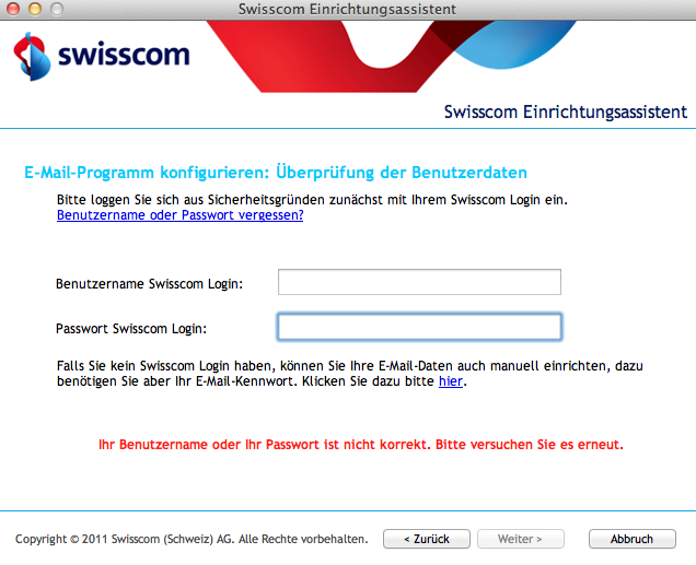 Ich möchte auf meinem iMac einrichten, dass ich die E-Mails im Apple Mail empfangen und versenden kann. Neu gibt es ja da denn EInrichtungsassistent (was ich zuerst toll fand, denn bis jetzt habe ich es - trotz 1 zu 1 mit der manuellen Einrichtung - einfach nicht hingekriegt). Leider komme ich mit dem Einrichtungsassistent nicht sehr weit: zu beginn muss man sich aus Sicherheitsgründen mit dem Swisscom Login einloggen. Obwohl ich mich mit dem Benutzernamen und Passwort einlogge, mit dem ich mich im Browser über den Swisscom Login zu meinen Mails komme, bekomme ich hier die Meldung: Ihr Benutzername oder Ihr Passwort ist nict korrekt. Bitte versuchen Sie es erneut.