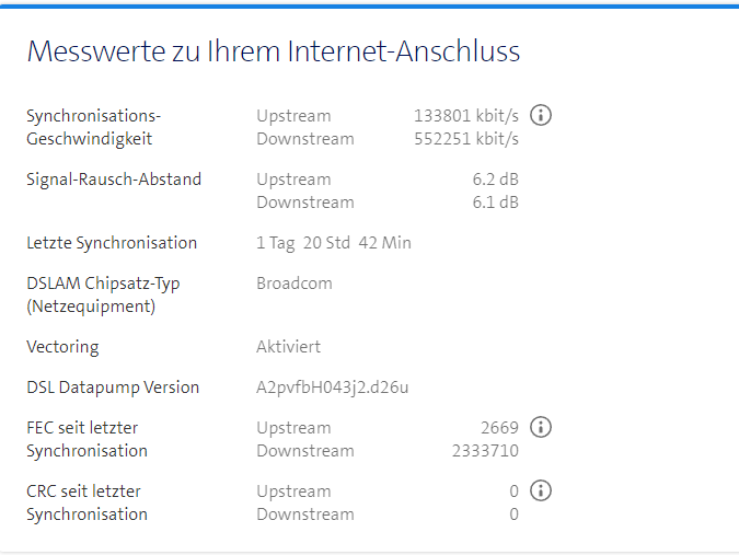 Vor 1 Tag 20 Std 42 Min wird eine Neusynchronisation angezeigt, wenn es keinen bekannten Grund dafür gibt (Neustart der Box, Softwareupgrade) so kann das auf ein Problem hinweisen.