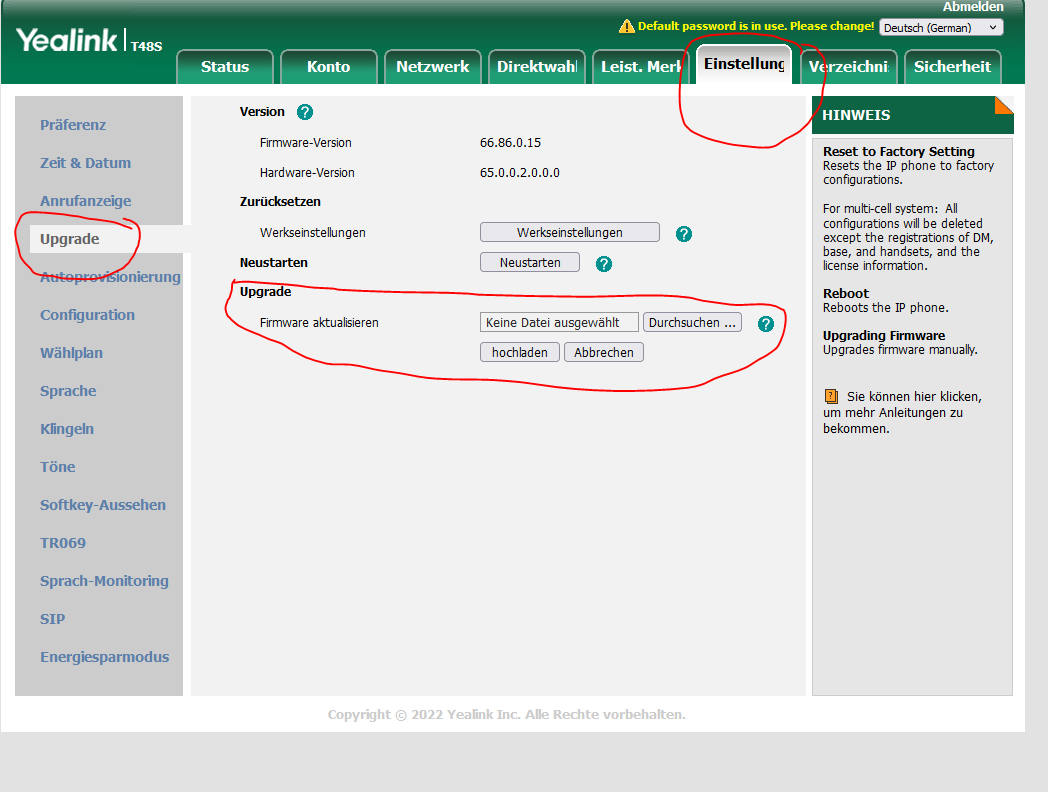 Somit konnte ich mich über das Webinterface (Browser deiner Wahl, dann bei der Adresseingabe die IP des Telefons eingeben) mit den Standart Logindaten anmelden.