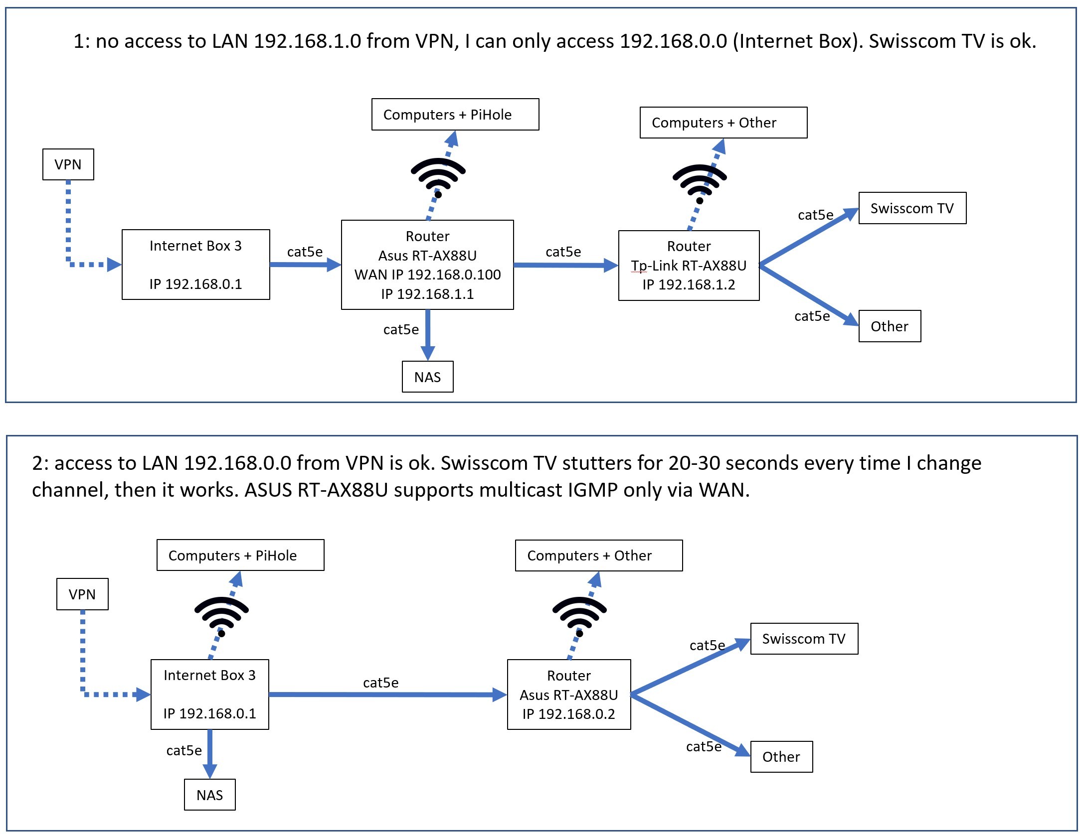 L'alternativa è la configurazione 2, dove posso accedere a tutta la rete tramite VPN, ma in questa configurazione ho un problema con la Swisscom TV: lo streaming si blocca per 20-30 secondi ogni volta che cambio canale. Forse è perché il mio router Asus non supporta il multicast IGMP su LAN (funziona solo se connesso su WAN)? Preferirei questa configurazione perché voglio utilizzare l'app di Swisscom per il parental control e anche accedere al mio NAS e Pi-hole da remoto.