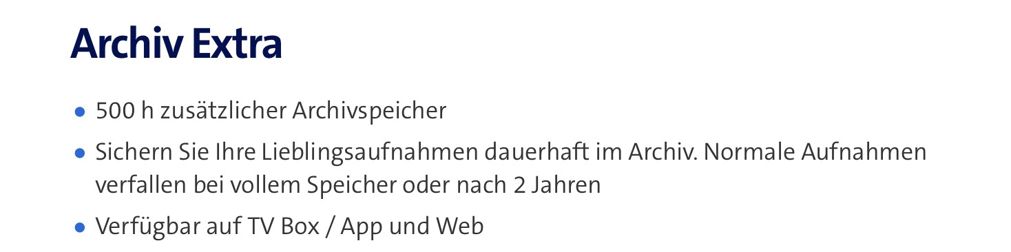 Ich nerve mich zur Zeit ebenfalls wegen der wiederholten Meldung, dass der Aufnahmespeicher fast voll sei. Mein "Problem": Ich habe (nach kürzlicher Aufstockung durch die Swisscom/blue) bei meinem Abo (TV L) 2000 Std. Aufnahmespeicher zur Verfügung, dazu habe ich aber schon vor längerer Zeit (für 5.--) 500 Std. zusätzlichen Speicher abonniert (neu als Archiv extra ausgewiesen). Somit müsste ich also 2500 Std. Aufnahmespeicher zur Verfügung haben.