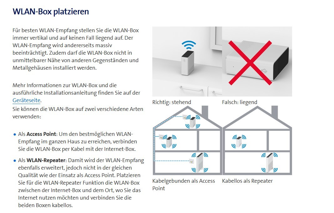 Leider kann ich mit dem Handy nur den Namen des neuen Netzwerkes erkennen, kann aber wiederum nicht auf das Internet. Ich habe ein neues LAN Kabel an einem andern Anschluss des Swisscom Internet Routers 3 eingesteckt. Dies hat nichts gebracht. Auch das Abschalten des Routers für 10 Minuten und wieder Einschalten hat nichts gebracht. Am Router ist die Einstellung "DHCP" aktiviert. Den Wifi LAN Adapter beim Router hatte ich mit dem Wifi Adapter verbunden, beide leuchteten konstant weiss. Nun leuchtet der LAN Adapter beim Router konstant rot, bedeutend, dass er keinen Kontakt mit dem andern Adapter hat. Wie bringe ich das Netzwerk zum Funktionieren? Besten Dank für jede Hilfe.