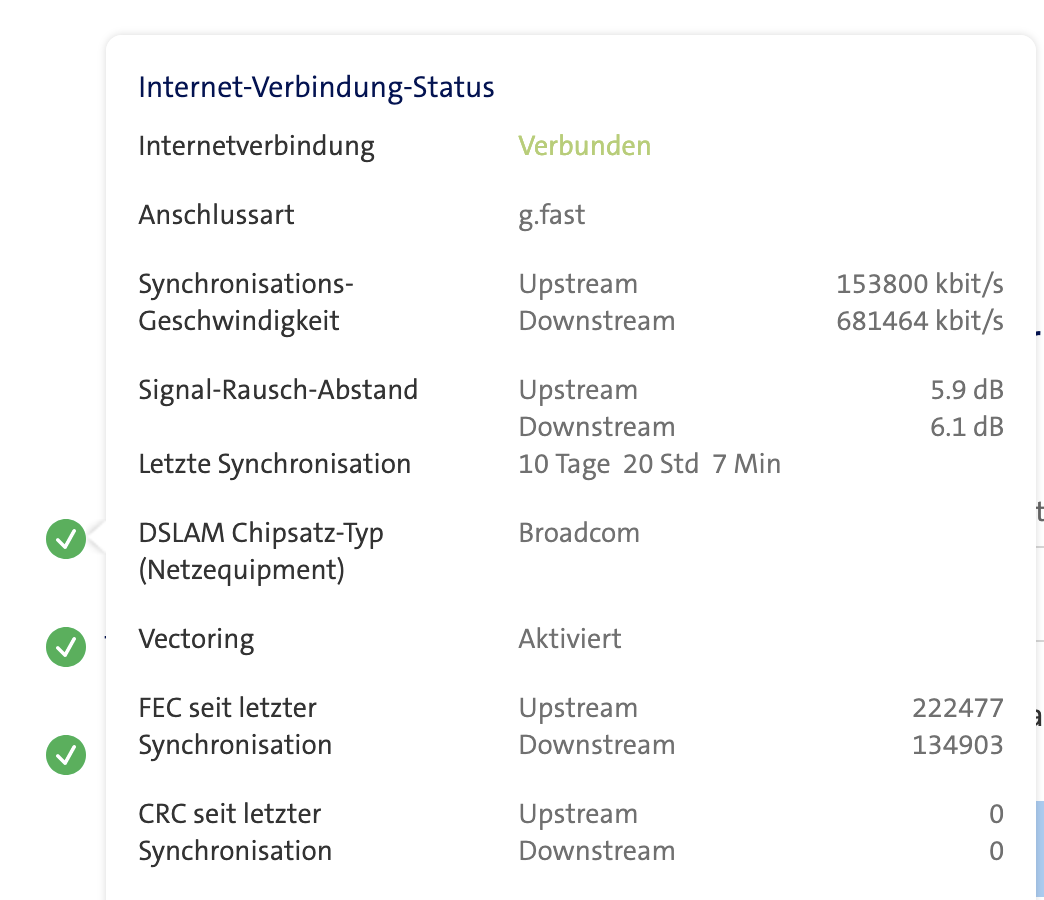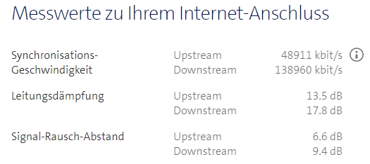 Da ich damals nicht locker gelassen habe, kamm nach vielen Telefonaten mal ein Technicker vorbei, der feststellte, dass die Freileitung "hinüber" ist. Diese wurde auch umgehend ausgetauscht, eine Besser Qualität als Standard laut Monteur damals, worauf der Speed sogar auf 150/35 stieg.