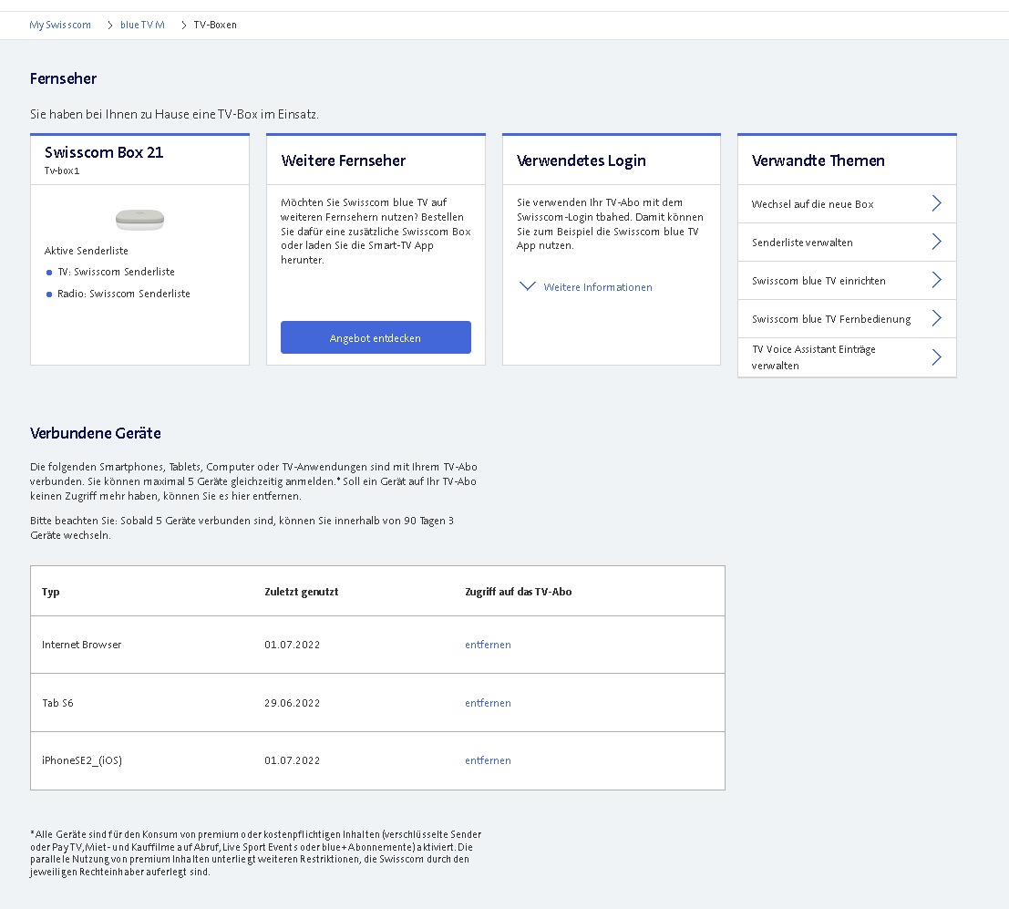 Welche und wie viele aktiven Geräte für TV werden im Kundencenter mySwisscom angezeigt?