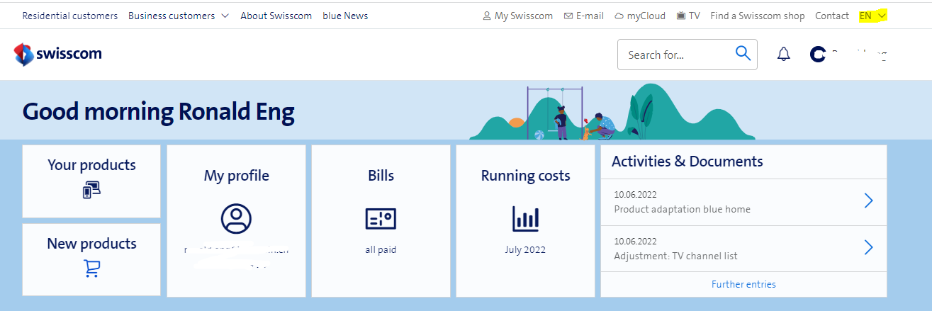 Fiezangoz68 The language in the Dashboard you can change as shown in the picture below (yellow highlighted), then almost everything in MySwisscom will be shown in English, the language remains as long as you don't change it, even if you leave and re-enter MySwisscom.
