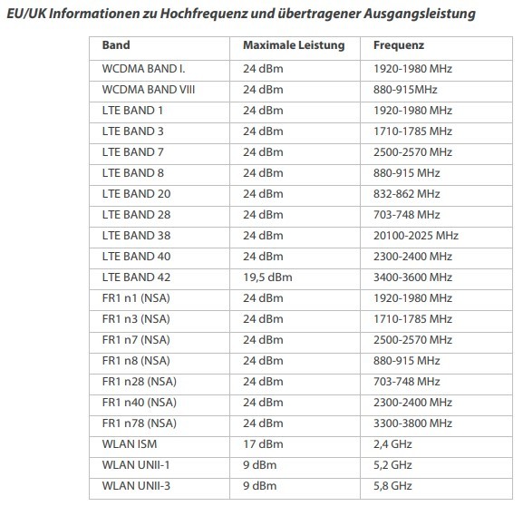 Das Modell für Nordamerika T-Mobile (Modell 2000A) unterstützt viel mehr Bänder 1,2,3,4,5,7,8,12,13,14,17, 20, 25, 26, 28, 29, 30, 38, 39, 40, 41, 42, 46, 48, 49, 66, 71. Die EMEA-Variante (Modell 2000B) unterstützt für 4G laut dem Handbuch nur 1,3,7,8,20,28,38,40,42. Ich frage mich ob für Swisscom ebenfalls eine andere Konfiguration verwendet wird.