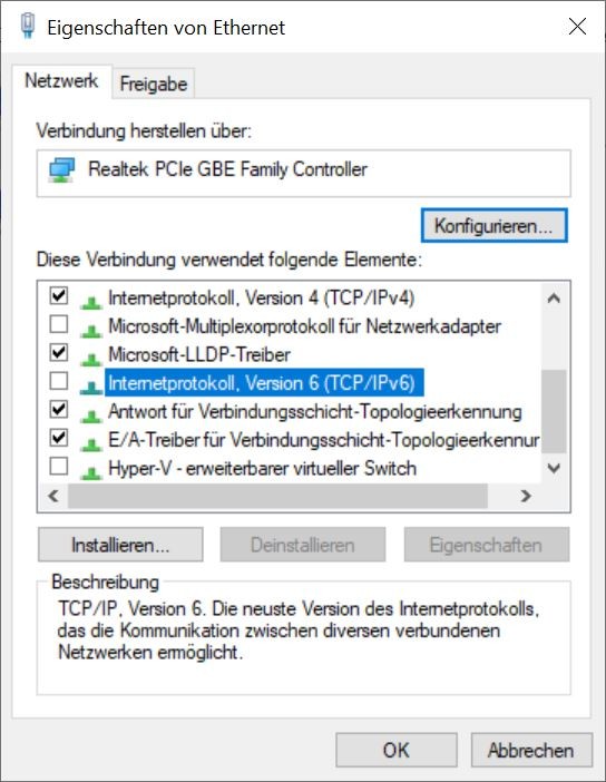 IPv6 sowohl auf Router und gleichzeitig auch auf der Ethernet-Verbindung deaktiviert.