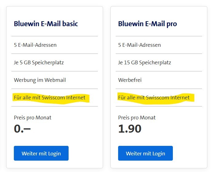 - wenn es denn unbedingt sein muss mit der @Bluewin.ch Adresse, dann einzelne Bluewin-Gratisadressen mit jeweils separatem Swisscom-Login