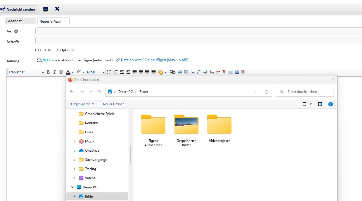 gerade wollte ich wie gewohnt (browser google chrome) einer Email einen Anhang hinzufügen. Beim klick auf "neu aus my cloud hinzufügen" öffneet sich ein zweites Fenster rechts daneben. Dort stand "Dateien vom PC hinzufügen". Das funktionierte in google chrome heute Morgen nicht. Mehrmalige erfolglose Versuche "aus meinem PC hinzufügen" scheiterten.