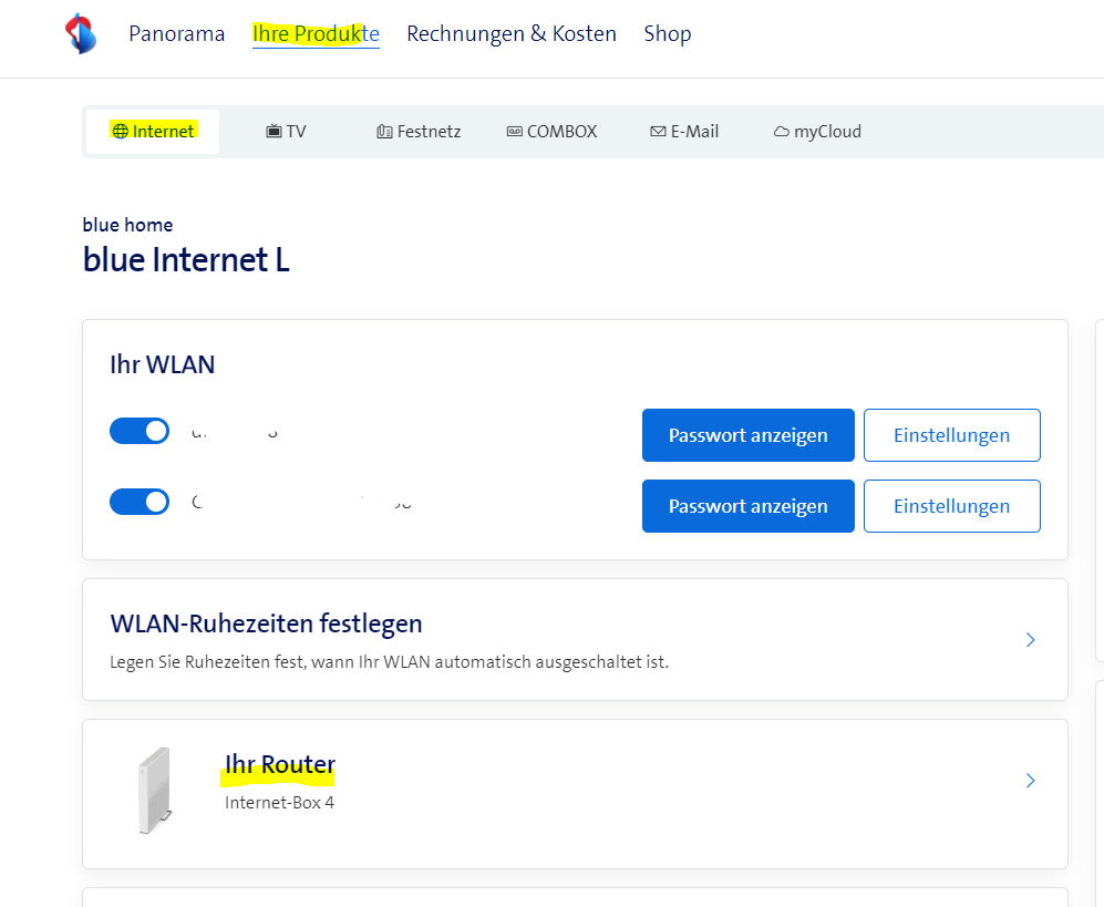 Gaeilgeoir @Cheunnauffie33 Im MySwisscom, ich nehme an, dass das gemeint ist: Unter "Ihre Produkte" -> "Internet" -> Ihr Router" (nur im Heimnetzwerk)