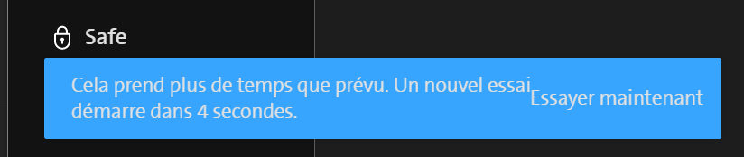 Dès que je clique sur fichiers, un message apparaît: "Cela prend plus de temps que prévu. Un nouvel essai démarre dans 4 secondes". Puis rien ne se passe. Il m'est donc impossible d'accéder à mes dossiers depuis tout ordinateur.
