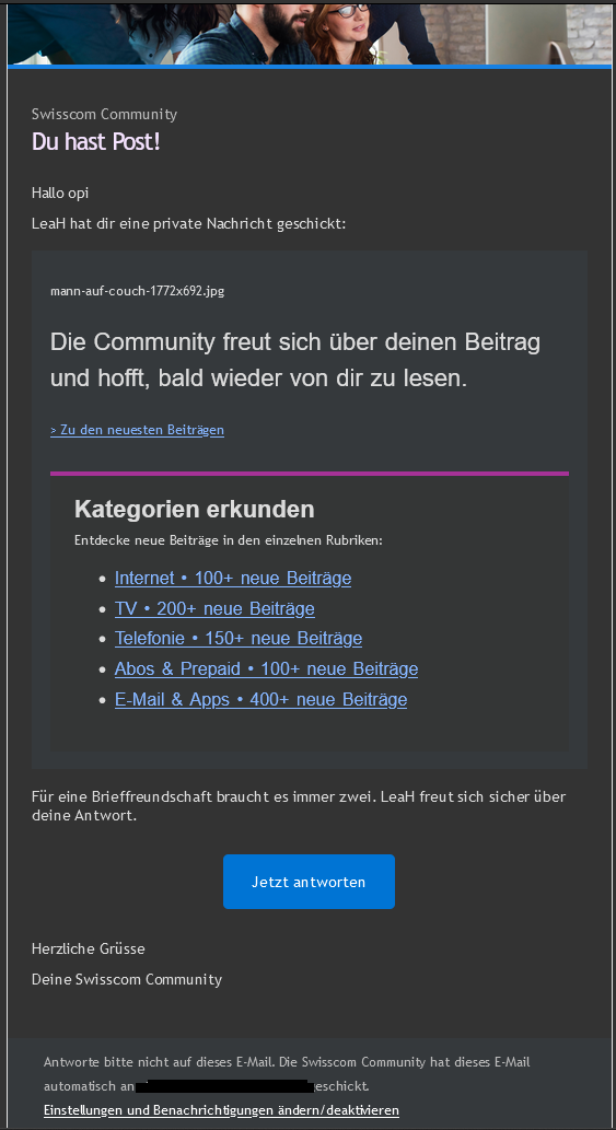 Ich bin schon einige Zeit in diesem Forum und habe noch nie eine PN erhalten, sonst wäre das nicht aktiviert, die dauernden Änderungen bei Einstellungen nach Update sind mühsam nicht nur bei Swisscom.