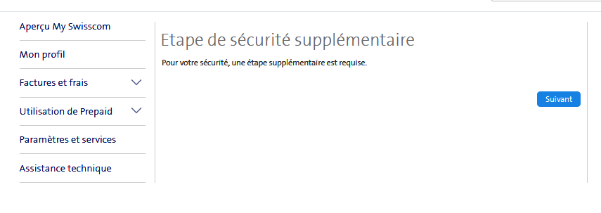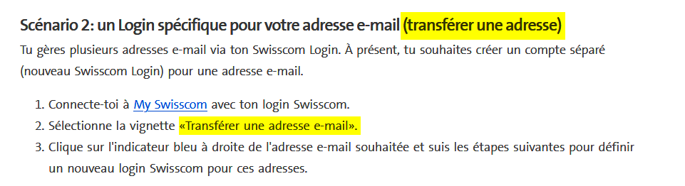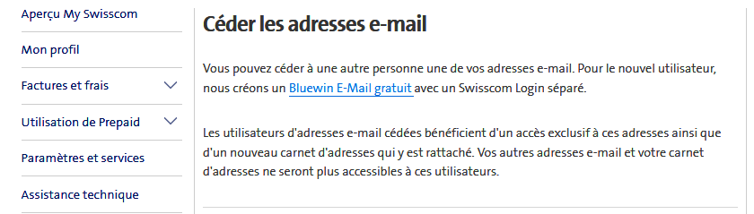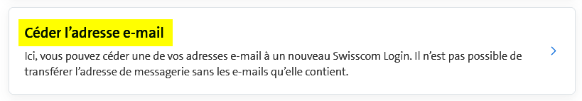 Si tu cliques sur Céder l'adresse e-mail, une nouvelle fenêtre s'ouvre. Cliques sur suivant pour confirmer ton Login Swisscom actuel.