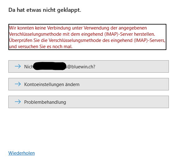 Ich möchte mein Bluewin-Konto mit dem Outlook verbinden. Ich erhalte immer die Meldung: "Da hat etwas nicht geklappt. Die Verbindung mit dem eingehend (IMAP)-Server wurde unterbrochen. Überprüfen Sie die eingehend (IMAP)-Servereinstellungen, und versuchen Sie es noch mal."