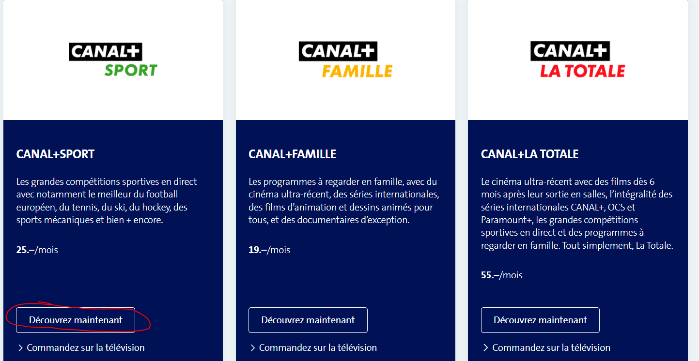 Je n'arrives plus retrouver sur le site de la liste des chaînes complètes avec l'option canal+ sport. Il y avait un tableau avec ces chaînes disponibles via bluewin tv (eurosport 1, eurosport 2, canal +, canal + sport, etc...) et celles disponibles via my canal qui avaient un petit logo my canal en bas (canal + sport 2, canal + f1, canal + moto gp, etc...).