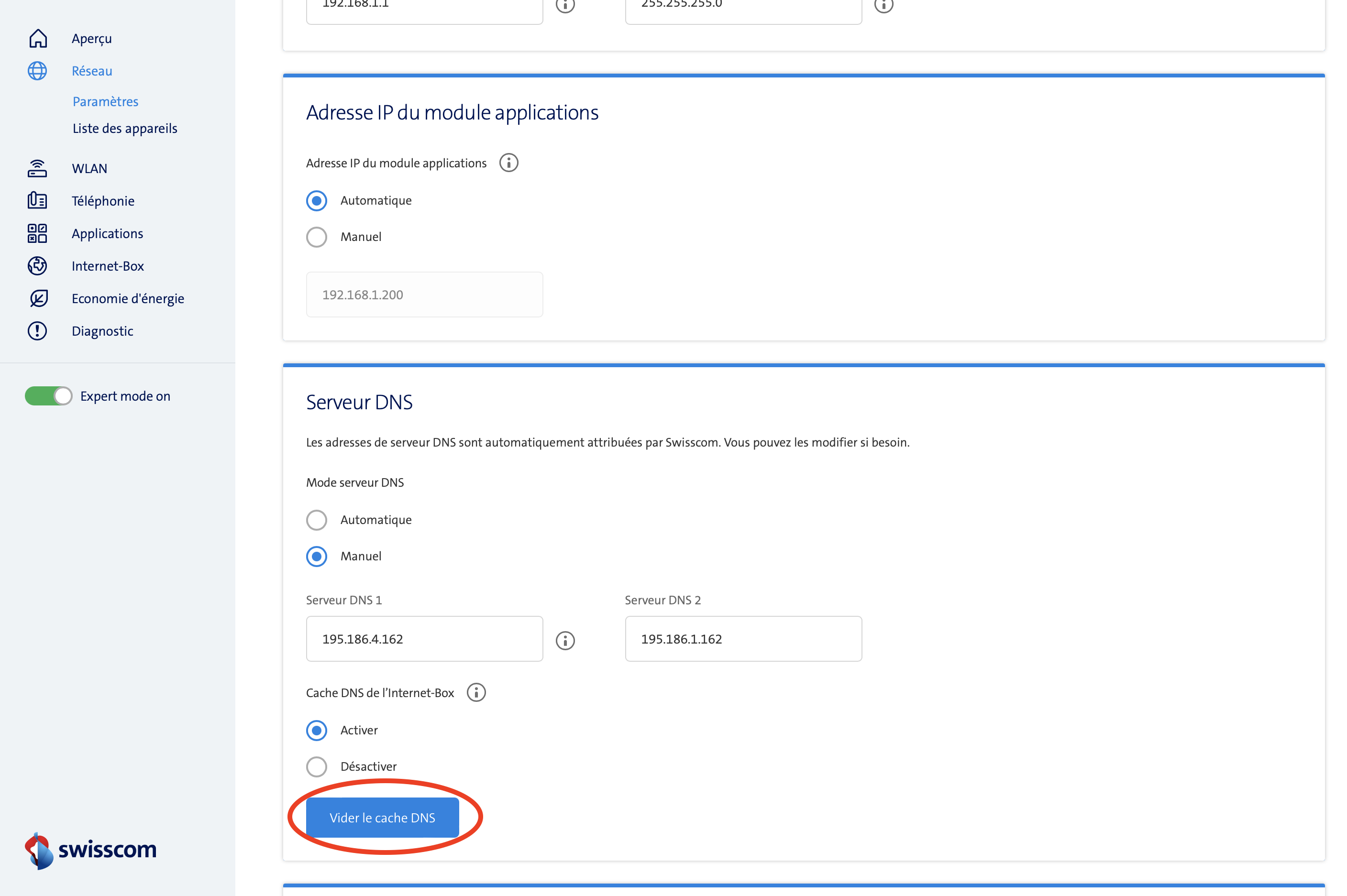 Doremi David.Tedeschi Hello Section "Réseaux, Paramètres" en mode "Expert mode on" ensuite sur la partie "Serveur DNS" il se trouve la case "Vider le cache DNS" clique dessus la case. Cordialement Doremi