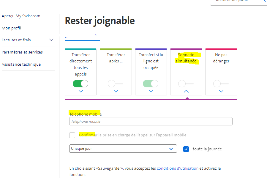 Avec la fonction Sonnerie simultanée, votre portable sonne en même temps que votre téléphone fixe. Vous ne manquez ainsi aucun appel quand vous êtes en déplacement. Vous pouvez activer la fonction dans My Swisscom(ouvre une nouvelle fenêtre) et y saisir le numéro de portable qui doit sonner en même temps que votre téléphone fixe.