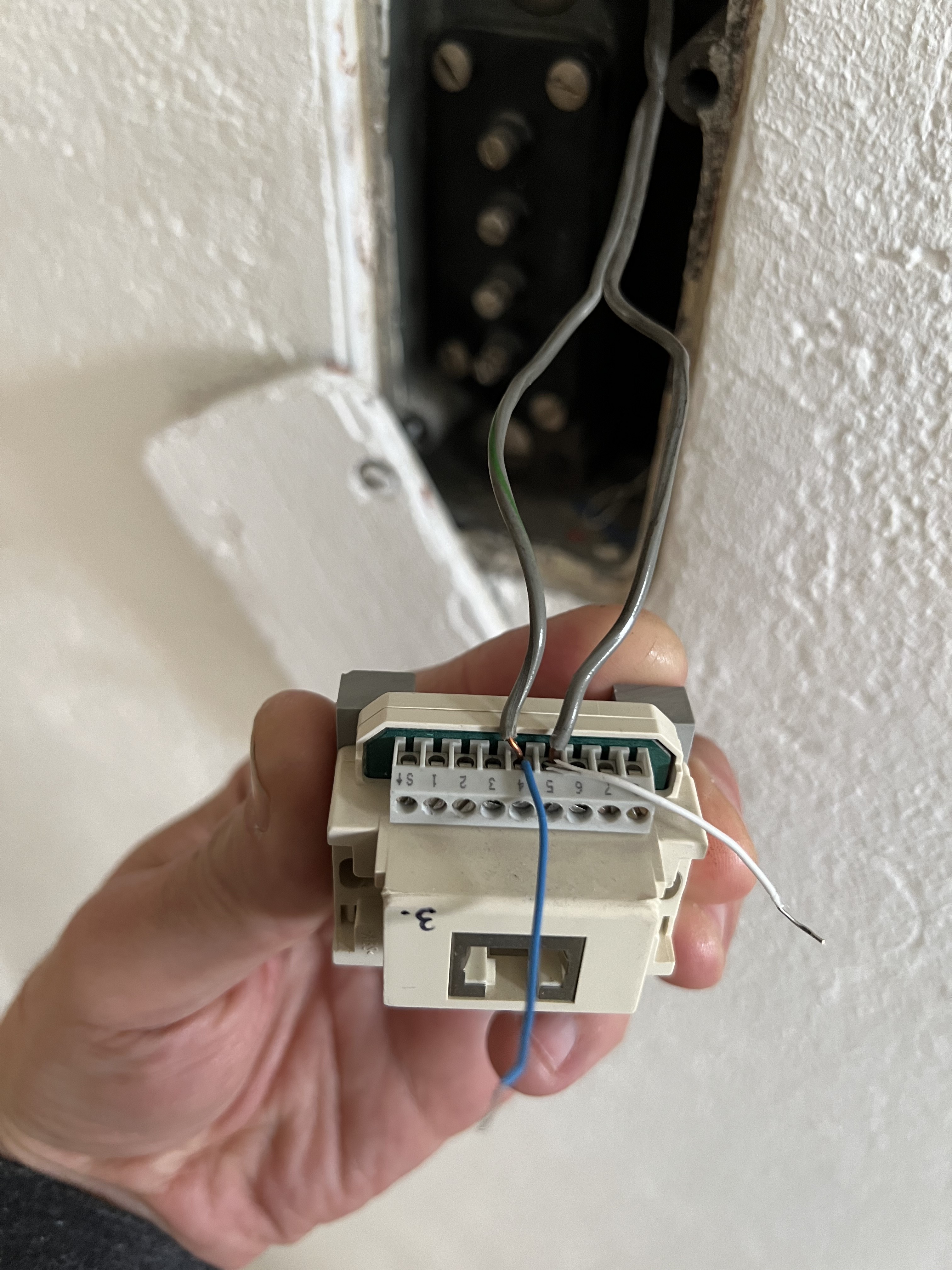 Tu n'aurais pas débranché les fils du bornier au fond pour mettre la prise. Moi ça me donne l'impression que la ligne de la centrale arrive sur les bornes dans le mur!