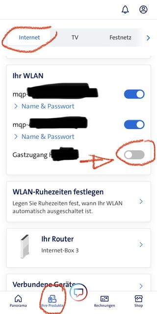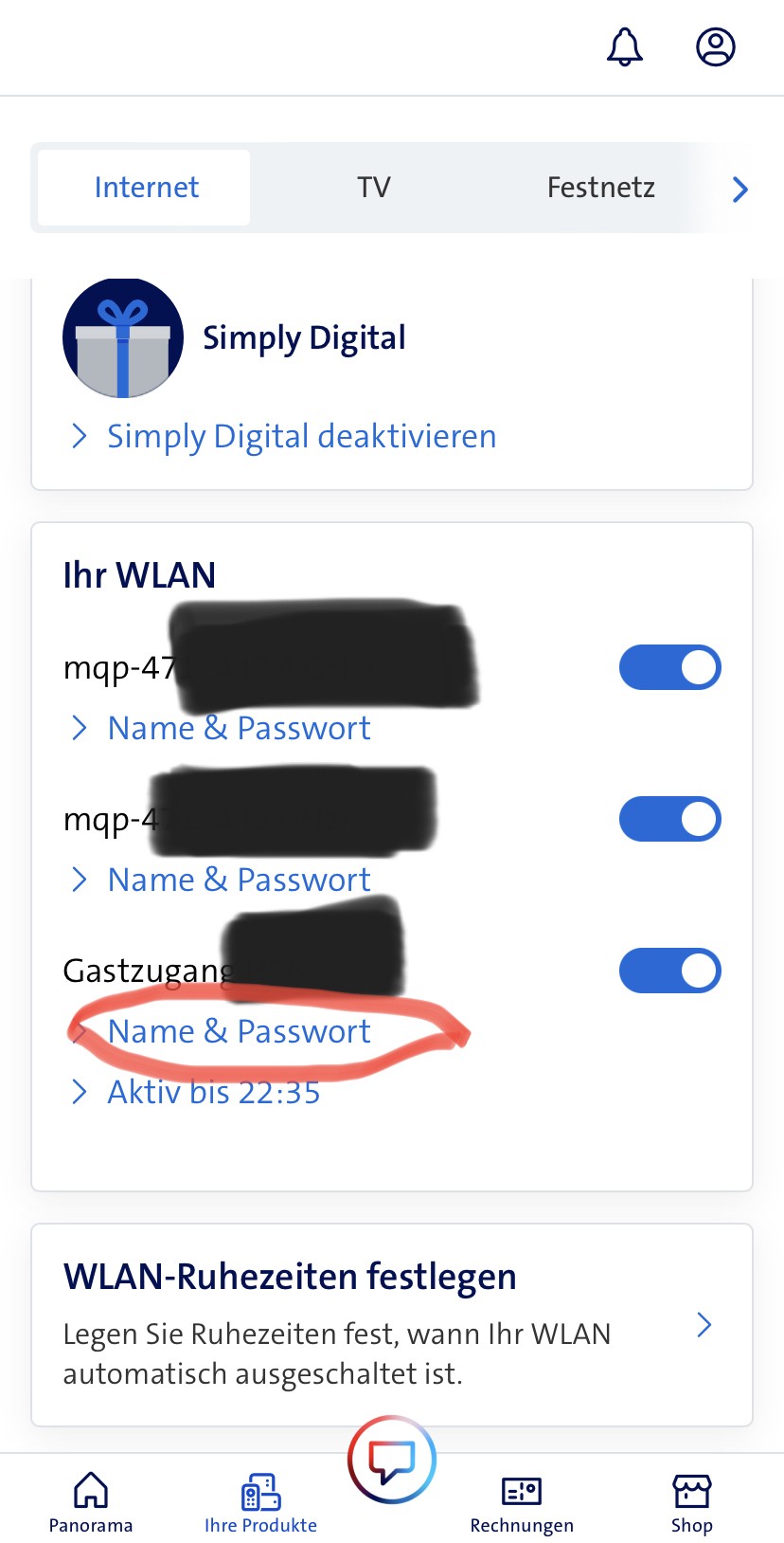 Gehe unten auf Produkte, dann oben auf Internet. Dann scrolle zu “ihr Wlan”. Dort sollte das Wlan “Gastzugang…” zu sehen sein. “Name & Passwort” erscheint erst, wenn man dieses Wlan aktiviert, also einschaltet, und kann dort gesehen und geändert werden.