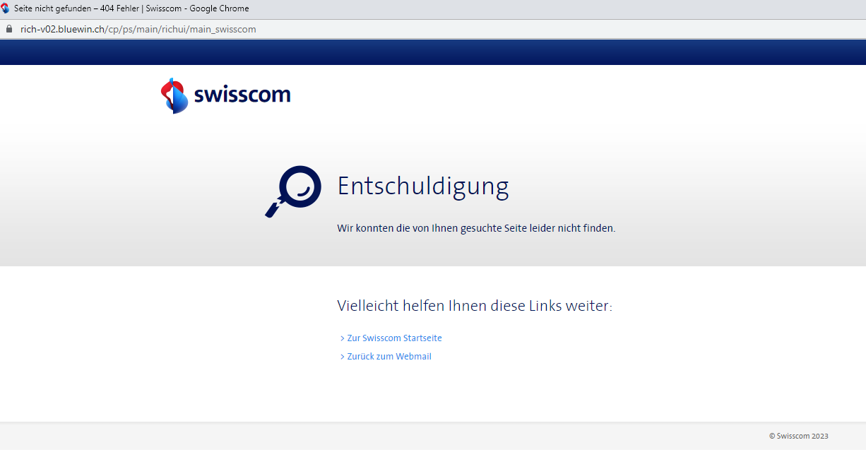 Huit fois sur dix, j'ai une erreur 404, Page introuvable, lors de la connexion à bluewin email avec le message "Désolé nous n'avons pas trouvé la page.. etc"...