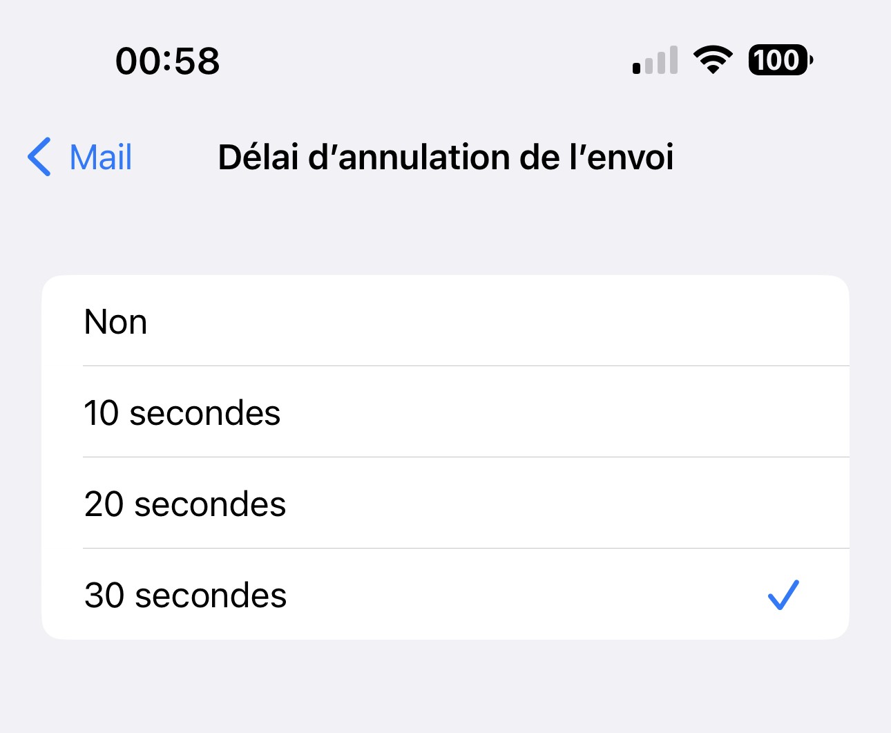 Il faut d'abord activer cette possibilité, par exemple sur un iPhone, allez dans les Réglages, puis Mail, et tout en bas sur Délai d'annulation de l'envoi.