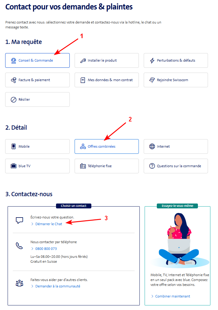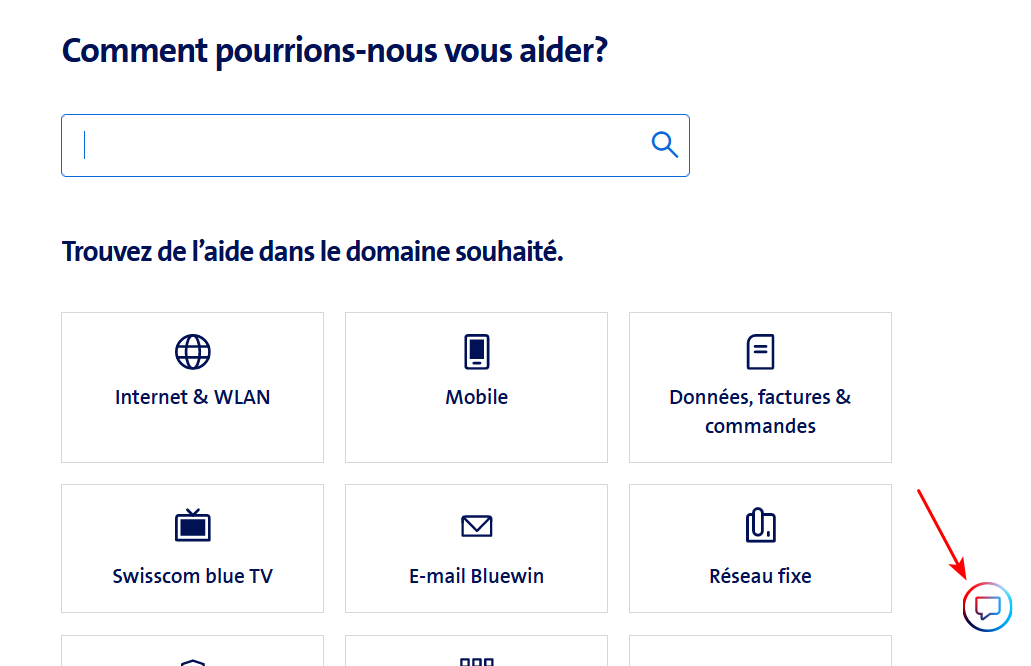 DanielD DanielD Si on passe par la page de contact on ne voit pas la bulle pour démarrer le chat. Il faut sélectionner les deux premières options, Ma requête + Détail, pour voir apparaitre la section Contactez-nous qui commence par l'option Démarrer le Chat. DanielD