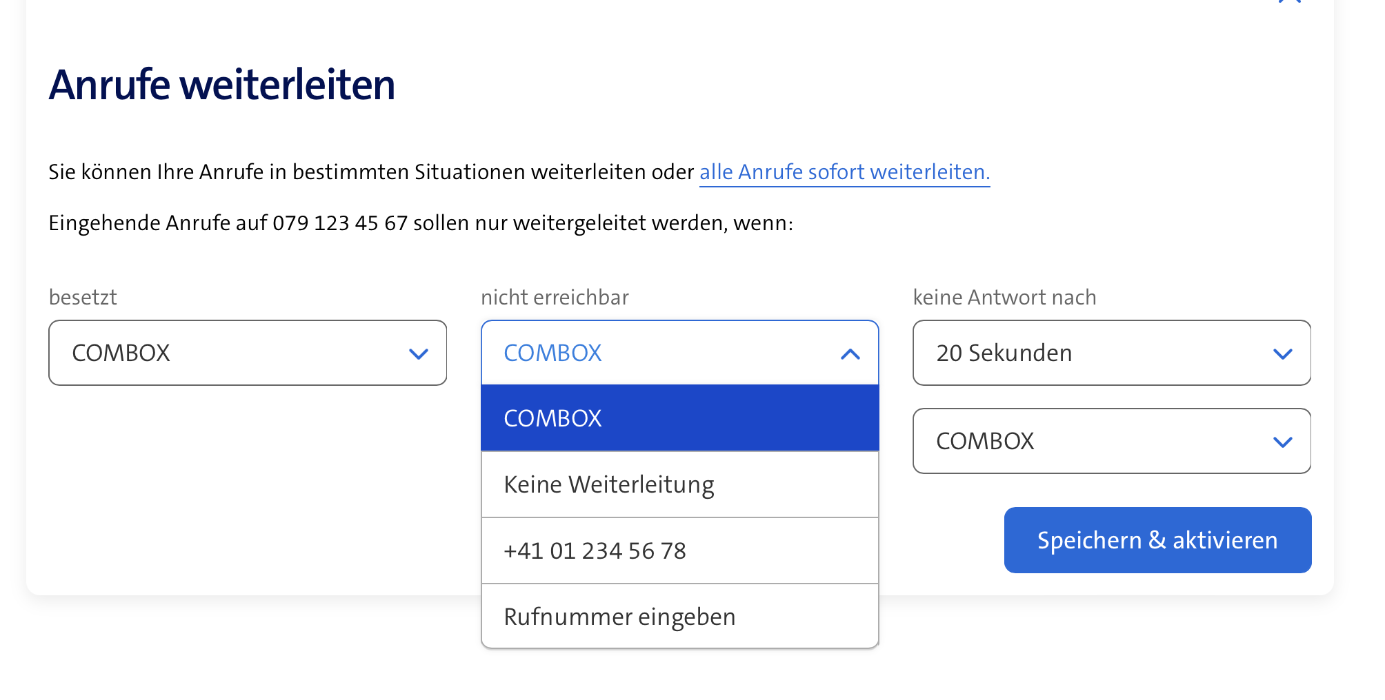 Im Fenster anschliessend "Wenn nicht erreichbar" auf die Festnetznummer setzen (falls diese angezeigt wird, ansonsten über Nummer eingeben die Festnetznummer eingeben)