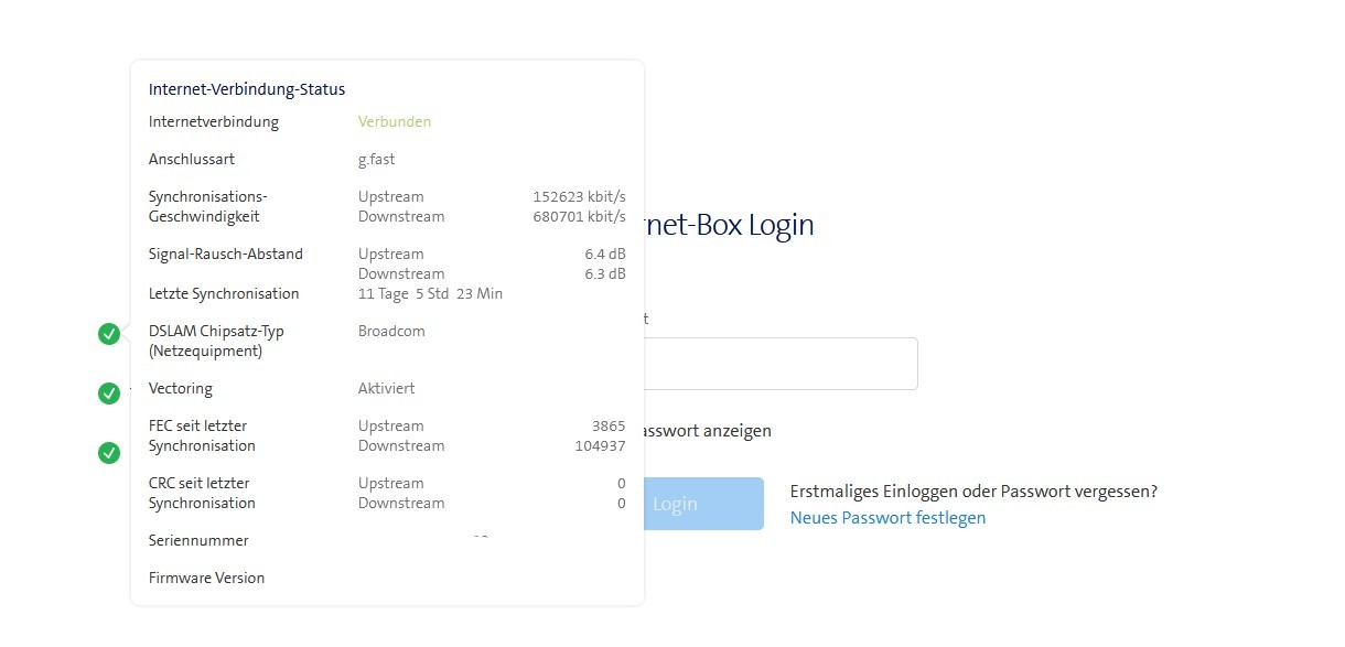 Kannst Du mal einen Speedtest machen, am besten mit einem PC oder Laptop an dem Kabel wo auch die TV Box zickt. Und auch mal die anderen Lan Anschlüsse testen. Auch ein Speedtest über WLAN wäre interessant. Auch ein Speedtest über das Interface der Internetbox wäre von Vorteil. Ob die Internetbox überhaupt den Speed gemäss Checker bekommt.
