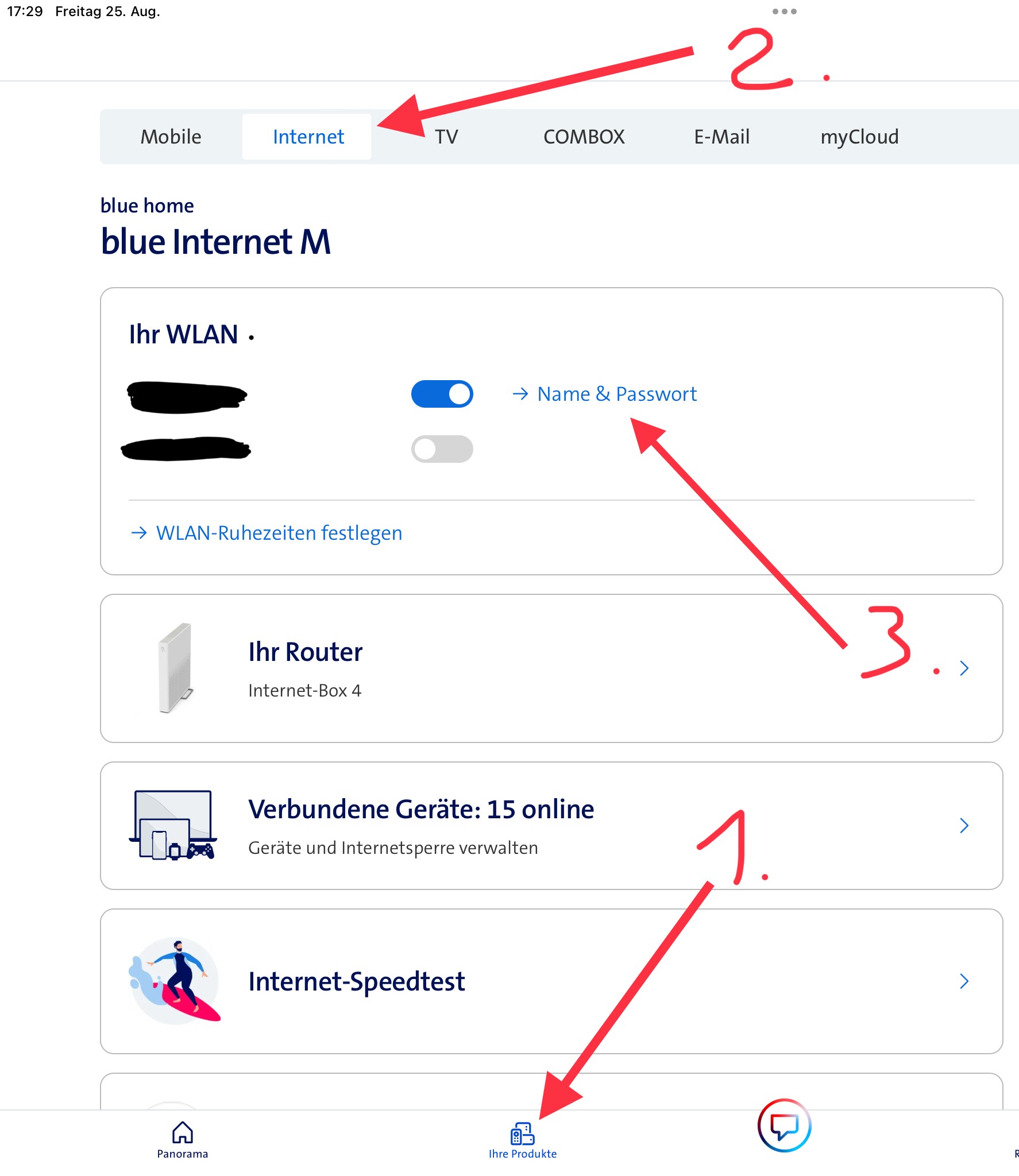 Stephan_76 Hallo Neinazu63 Eine weitere Möglichkeit ist die MySwisscom App. Auch da kann man das Passwort anzeigen lassen. Einfach unten auf meine Produkte klicken, dann oben Internet und dann auf Name & Passwort