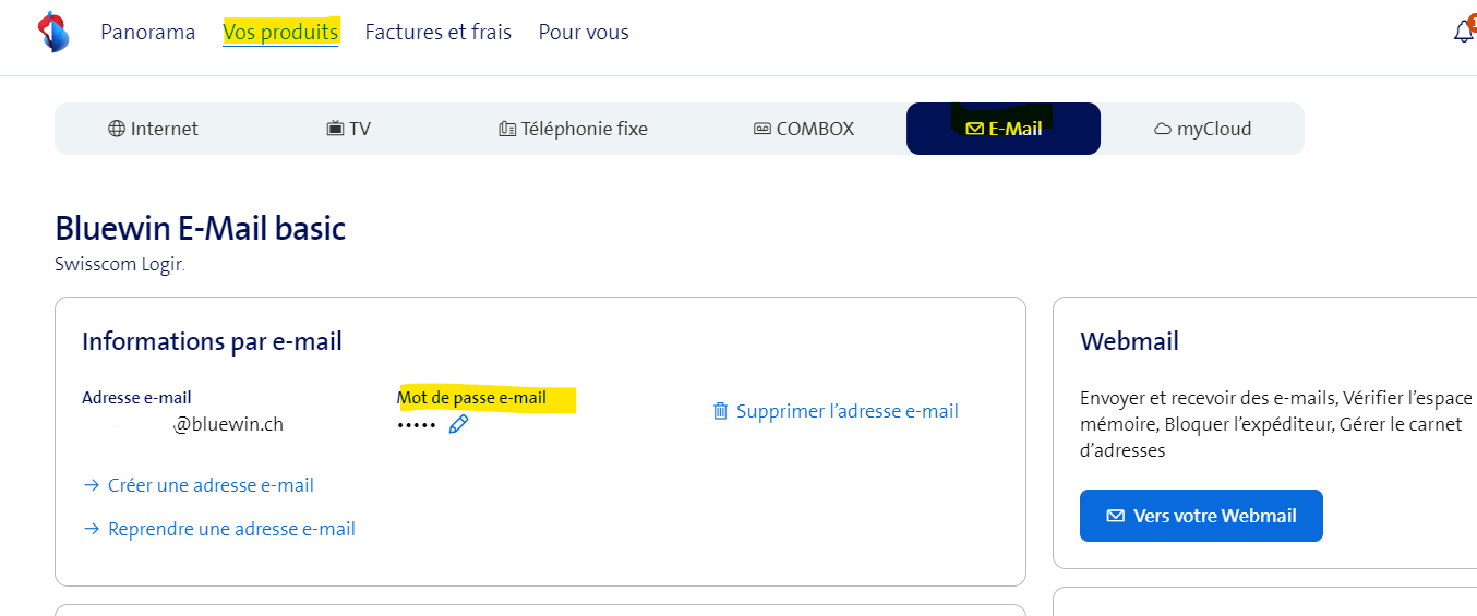 Gaeilgeoir Nofrefrutt26 Vous devez définir le mot de passe dans MySwisscom -> Vos produits -> E-mail (voir image) Ce n'est pas le même mot de passe pour le webmail/MySwisscom