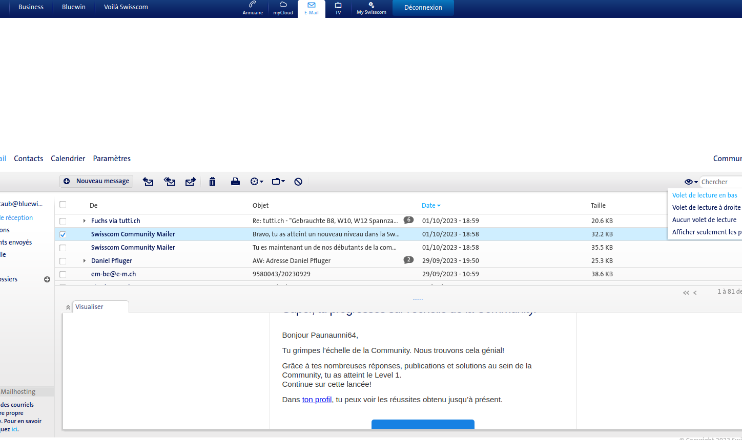 Il me reste un détail gênant: Il y a un quart de l'écran dans la partie supérieure (zone blanche) que je n'arrive pas à éliminer. J'utilise toujours l'option "Volet de lecture en bas" mais impossible d'éliminer cette zone blanche.