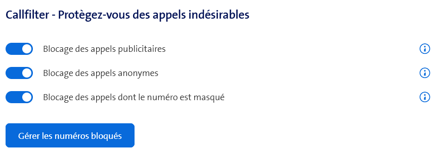 Aller sur MySwisscom, Vos produits, Téléphonie Fixe et activer le callfilter comme indiqué. De cette manière seuls les appels avec un numéro atteignent le raccordement. Les autres sont stoppés par le réseau.