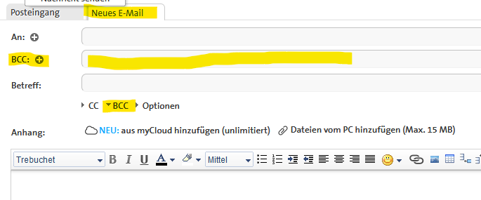 POGO 1104 Die Adresseempfänger müssen alle im "Bcc:" Feld stehen, dann sehen die Empfänger nicht, an wen die Mail alles ging
