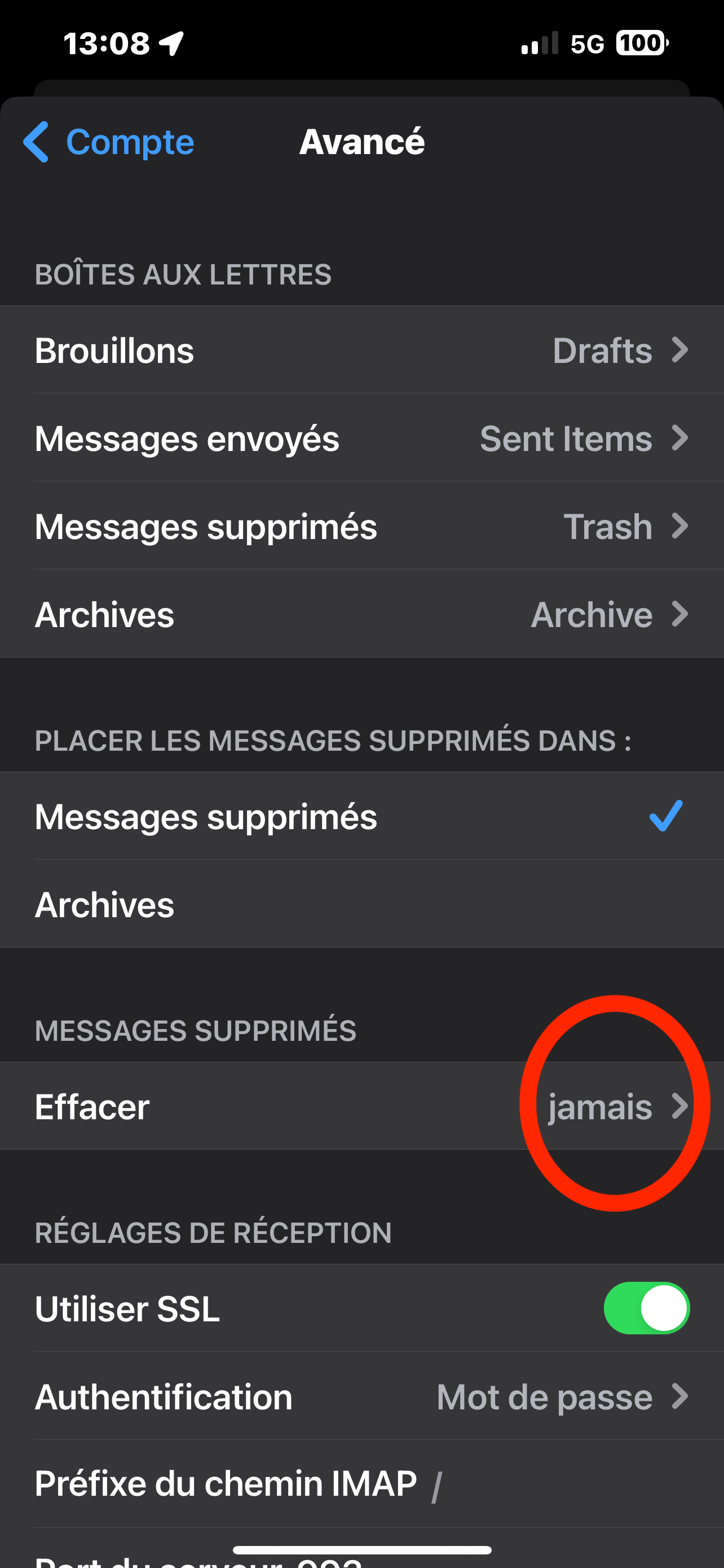 Rendez-vous sur le widget "Réglages", ouvrez la vignette "Mail" et sélectionnez le compte qui pose problème. Cliquez sur ce compte pour ouvrir les réglages disponibles. En bas de l'écran, vous verrez la case "Avancé". Changez la case "MESSAGES SUPPRIMÉS" en la réglant sur "Jamais".