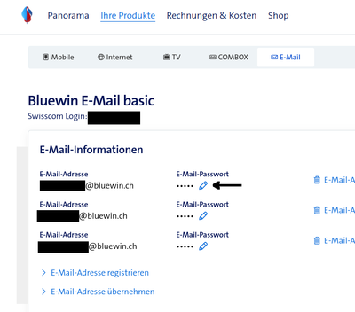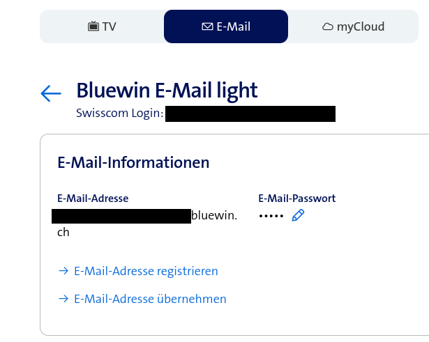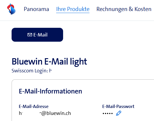 Stephan_76 Werner Hallo @Peschi35 Ich kann mich meinen Vorschreibern nur anschliessen. Auch beim Bluewin Light funktioniert es gleich. Voraussetzung ist wie bereits korrekt geschrieben wurde, dass Du mit dem richtigen Login ins MySwisscom gehst. Kommst Du mit Deinen Daten ins Webmail rein? Was kommt wenn Du folgenden Link probierst? https://www.swisscom.ch/myswisscom/products/mail