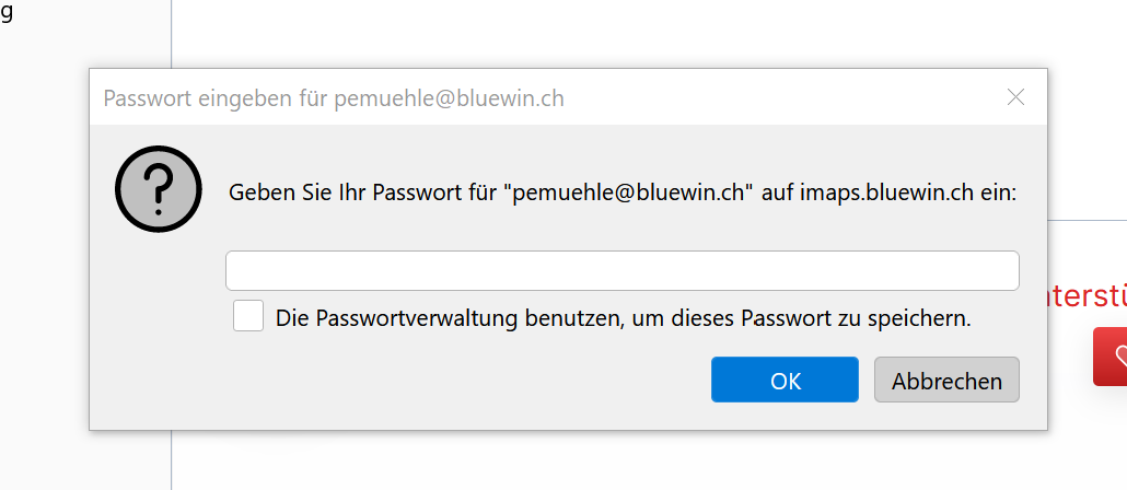 Peschi35 ich habe Thunderbird als Mailprogramm installiert, aber ich kann es nicht gebrauchen, weil die Meldung: Geben Sie das Passwort für "pemuehle @Bluewin.ch" auf imaps.bluewin.ch ein. Wo finde ich dieses Passwort? Gruss Peschi35
