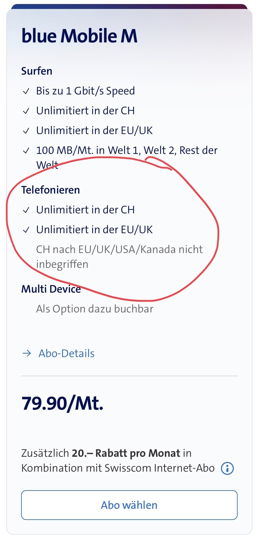 Ich habe neu ein "M" Abo. Ende März habe ich eine Telefongespräch auf eine Festnetznummer in Vorarlberg (Oesterreich, EU) geführt. Dieses Gespräch wurde nicht über die Monatspauschale abgerechnet, es erschien separat und damit zusätzlich als Kosten.