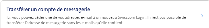 Ici, vous pouvez céder une de vos adresses e-mail à un nouveau Swisscom Login. Il n'est pas possible de transférer l'adresse de messagerie sans les e-mails qu'elle contient.