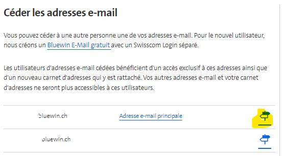 Vous pouvez céder à une autre personne une de vos adresses e-mail. Pour le nouvel utilisateur, nous créons un Bluewin E-Mail gratuit avec un Swisscom Login séparé.