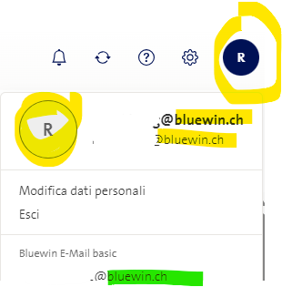 Questo non verrà più visualizzato insieme, ma spiegherò come visualizzare l'altro indirizzo. Deve cliccare sul pulsante del profilo in alto a destra (nell'immagine qui sotto, la R evidenziata in blu), poi quello che appare nell'immagine, in alto accanto all'immagine del profilo evidenziata in giallo appare l'indirizzo e-mail attualmente utilizzato, se vuò cambiare deve cliccare sull'indirizzo e (evidenziato in verde), poi questo viene utilizzato, così può passare avanti e indietro tra i singoli indirizzi