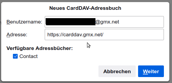 - Bei Adresse gibst Du https://carddav.gmx.net/ ein